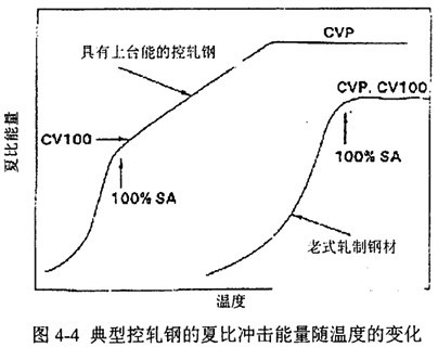 對于斷口上有分離的材料,隨溫度的升高,分離將最終消失,這是因為馬氏體和貝氏體帶也達到了上平臺溫度。圖4-4表示典型控軋鋼的夏比能量隨溫度的變化。夏比沖擊試樣上100%剪切面積對應的最小夏比能稱為CV100。當所有的分離都消失時,上平臺能CVP出現(xiàn),其大小可能高于CV100。