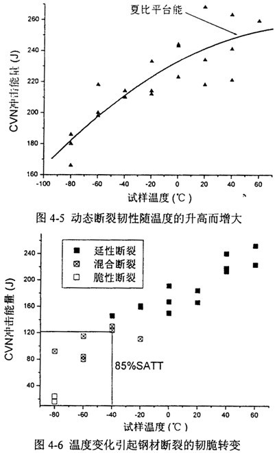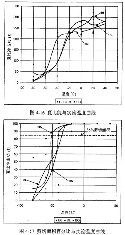 表4-3給出了歸納的夏比沖擊能量值及85%剪切面積對應的轉(zhuǎn)變溫度。