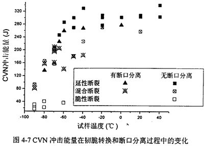 圖4-7選擇的管線鋼在實驗溫度范圍內(nèi)同時經(jīng)歷了韌脆轉(zhuǎn)化和斷口分離,對上述結(jié)論給予了證實,并可以看到發(fā)斷口分離的試件的韌性稍低于未發(fā)生斷口分離的試件。