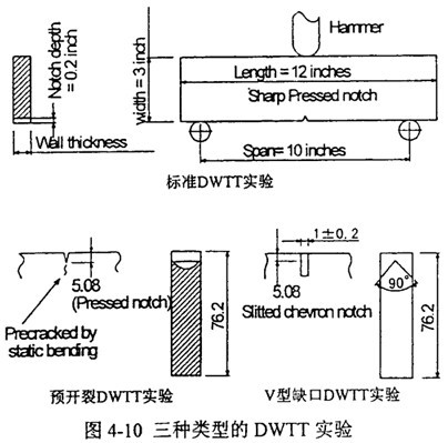 實驗證實,對有上臺能的控軋鋼進行的實驗中,標準DWTT實驗比夏比沖擊實驗在評價延性裂紋擴展行為上有更好的對應關系。但對于高韌性的淬火回火鋼,標準DWTT試樣由于在起裂過程中吸收了大量的功,致使裂紋擴展的應變速度過低而與真實擴展狀況不符。采用靜態(tài)預制裂紋DWTT試樣或雙試樣DWTT法是解決這一問題的兩種方案,如圖4-10所示。