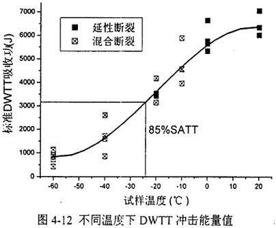 圖4-19顯示了標準壓制缺口DWTT試樣能量與實驗溫度數(shù)據(jù)。