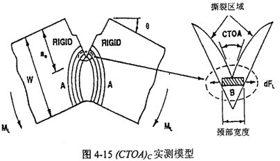 (CTOA)c可以通過攝像機從實物裂紋擴展的照片上觀測得到,也可同CVN或DWTT實驗建立聯(lián)系。Wilkowski分別建立了基于CVN和DWTT吸收功的(CTOA)c經(jīng)驗算法,模型如圖4-15。另一種方法是通過測定作用于試件上的總功,從裂紋擴展能的角度計算(CTOA)c。