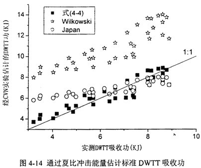 圖4-14將(4.2)~(4.4)式預測的對應關系同真實實驗結(jié)果做了對比?梢钥吹綄τ谙嘟腃VN韌性預測結(jié)果,實際的DWTT功從低到高在大范圍內(nèi)分布。