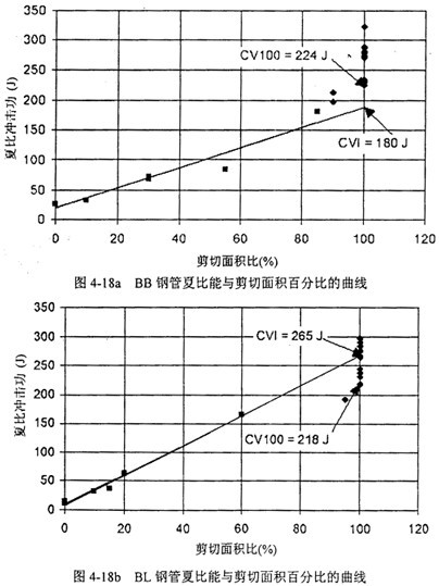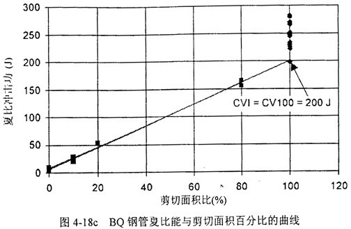 圖4-18a,b,c給出了三家鋼管的夏比能與剪切面積的關系,以及85%剪切面積對應的轉(zhuǎn)變溫度。圖中CV100表示100%剪切面積時最低的夏比能,CVI表示最低夏比平臺能,也稱夏比轉(zhuǎn)變能,CVP表示夏比平臺能。菱形實驗點表示剪切面積高于90%,方形實驗點表示低于90%可以看到,剪切面積低于90%時,夏比能與剪切面積呈線性關系。