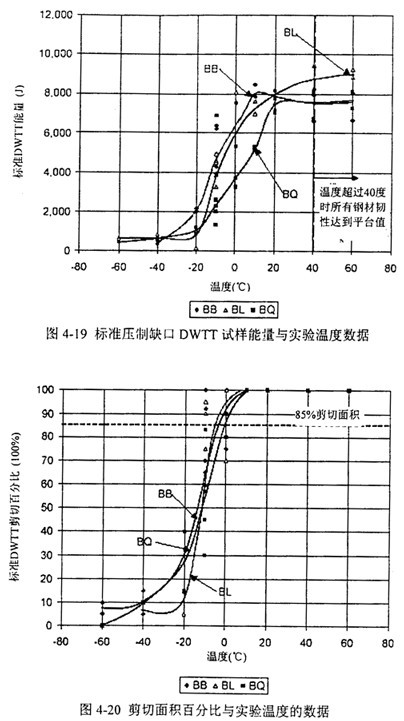 表4-4給出了這些DWTT實驗的特征值和85%剪切面積對應的轉(zhuǎn)變溫度。