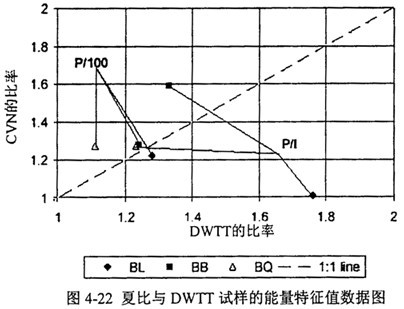 圖4-22是CVN與DWTT試樣的上臺能量特征值數(shù)據(jù)圖。總的來說,CVN與DWTT試樣的特征能量比率有較好的一致性。圖中P/100的符合性比P/I更好,很大程度上是因為CV100、DWTT-100比CVN-I、DWTT-I的獲得方法更為明確。