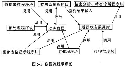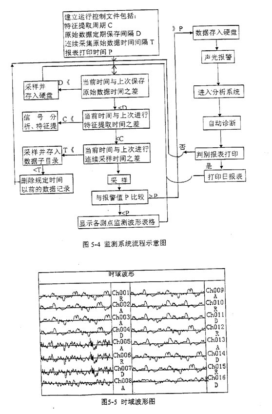 軟件的各個(gè)模塊通過(guò)動(dòng)態(tài)數(shù)據(jù)和運(yùn)行狀態(tài)數(shù)據(jù)庫(kù)聯(lián)系在一起,在下位機(jī)中,監(jiān)測(cè)系統(tǒng)控制著動(dòng)態(tài)數(shù)據(jù)的采集、存儲(chǔ)、顯示和預(yù)處理,同時(shí)把監(jiān)測(cè)結(jié)果存入各機(jī)組運(yùn)行狀態(tài)特征數(shù)據(jù)庫(kù)。在上位機(jī)中,詳細(xì)分析診斷程序塊調(diào)用運(yùn)行狀態(tài)數(shù)據(jù)庫(kù),得出診斷結(jié)果并調(diào)用打印程序塊輸出。圖5-3為數(shù)據(jù)流程示意圖,圖5-4為監(jiān)測(cè)系統(tǒng)流程示意圖。