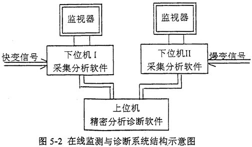 為了適應(yīng)日益更新的生產(chǎn)實(shí)際多種類(lèi)型參數(shù)監(jiān)測(cè)和故障診斷的要求,建立由多臺(tái)微機(jī)并行運(yùn)行構(gòu)成的在線連續(xù)實(shí)時(shí)監(jiān)測(cè)與快速診斷系統(tǒng)。圖5-2為多微機(jī)在線監(jiān)測(cè)與診斷系統(tǒng)結(jié)構(gòu)示意圖。這樣做的優(yōu)點(diǎn)是: