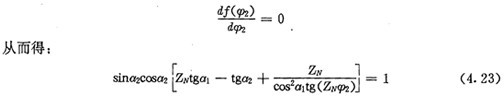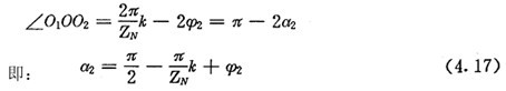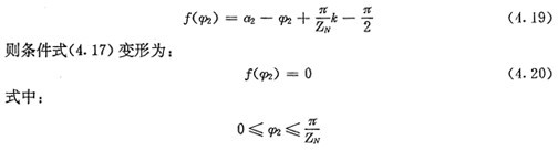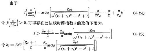 上式就是齒廓AB上與跨槽數(shù)為k的齒廓具有公法線的點(diǎn)的條件。當(dāng)k確定后,若存在公法線,則由(4.17)式并結(jié)合基本關(guān)系式(2.38)等可解出