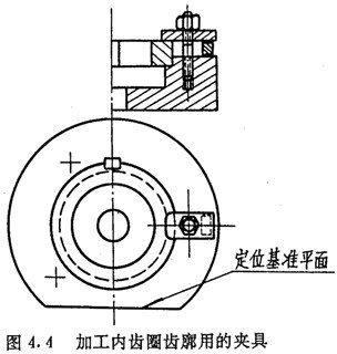 內(nèi)齒圈齒廓的數(shù)控加工,是在齒圈外徑及兩端面都精加工后進(jìn)行的,因此,應(yīng)以端面及外徑作為定位基準(zhǔn)。其夾具可做成螺釘壓板結(jié)構(gòu),如圖4.4所示。夾具內(nèi)徑應(yīng)盡量接近齒圈外徑,用千分表以?shī)A具內(nèi)圓為基準(zhǔn)找正工作臺(tái)軸心。