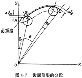 分段修形法是為了達(dá)到較理想的修形狀態(tài)而提出的一種能夠在數(shù)控加工中實(shí)現(xiàn)的齒廓修形方法。它根據(jù)修形后要達(dá)到的目標(biāo),將齒廓分成三段,如圖4.7所示,在工作段BC內(nèi)只進(jìn)行微量的等距修形,在齒頂段AB及齒根段CD內(nèi)同時(shí)進(jìn)行等距△Tz和移距△l增量函數(shù)修形。