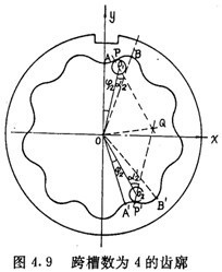 如圖4.9 所示,AB是其中一個(gè)齒槽的一側(cè)齒廓,A′B′是跨槽數(shù)為K(圖中k=4)的一個(gè)齒梢的另一側(cè)齒廓,它們是兩個(gè)性質(zhì)不同的齒廓。若把AB看成是工作齒廓,則A′B′是非工作齒廓。選擇圖4.9所示的坐標(biāo)系,讓坐標(biāo)原點(diǎn)O與內(nèi)齒圈幾何中心重合,y軸與OA重合。設(shè)P(x,y)為AB齒廓上的一點(diǎn),在P點(diǎn)與內(nèi)齒圈齒廓相接觸的外滾子的位置角為