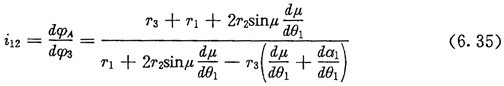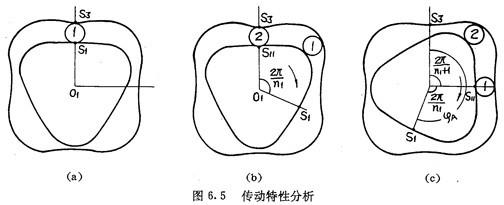 另一方面,由于的比的比值為常數(shù)i13,a2的值已由(6.12)式確定。比較(6.19)式與(6.12)式可知,只有在a1=0且μ= 時,它們才是一致的,由(6.10)式及(6.11)式知,只有在 時才有μ= ,且a1=0,由于太陽輪的節(jié)曲線是周期性,所以在一周內只有2n1個點(nl是太陽輪節(jié)曲線的周期數(shù))有 ,其余各點 都不為零,對于太陽輪的轉角 只要不是對應于 ,式(6.19)與式(6.12)是矛盾的,也就是說M2點必然不會與M1、O1位于同一直線上。這說明當傳動比為常數(shù)時,行星輪與太陽輪、行星輪與內齒圈所組成的兩個嚙合副不可能都作純滾運動,一定有一個嚙合副有滑動,因而活齒傳動都是滑滾運動。