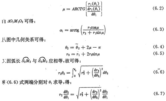 根據(jù)(6.33)式,可由任給的 確定出太陽輪起點S1至1號行星輪與太陽輪節(jié)曲線的接觸點M1所來的中心角θ1,然后代入(6.30)式,可得l號行星輪中心O2與內齒圈初始件S3所夾的中心角 ()。用 代替(6.33)式中的 ,將解得的θ1值代入(6.30)式,便可得到第2號行星輪中心與內齒圈S3點所夾的中心角 ()。兩行星輪之間的中心角 為: