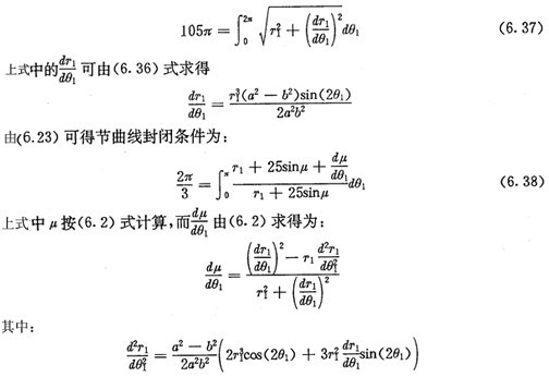 從以上設計過程可以看出,根據(jù)非圓太陽輪設計行星輪為圓的純滾動非圓行經(jīng)齒輪傳動機構時,并不是對任意指定的太陽輪節(jié)曲線都有解。當太陽輪節(jié)曲線的周期數(shù)n1給定后,節(jié)曲線必須有兩個可調整的參數(shù)(例中的a和b)的要由節(jié)曲線的封閉條件及輪齒等分條件來確定。齒輪模數(shù)m和太陽輪齒數(shù)z1是被預先指定了的。當各參數(shù)求出后,要用不干涉條件(6.28)式進行校驗,若發(fā)生干涉,應調整z1數(shù)值,重新計算太陽輪的可調整參數(shù)。