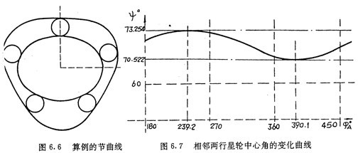 節(jié)曲線形狀如圖6.6所示。圖6.2為該輪系加上輪齒后的情形。按(6.34)式可算得相鄰兩行星輪之間的夾角隨 的變化規(guī)律,其關系曲線如圖6.7所示。由曲線圖可看出,當 時,夾角 有最小值 ,夾角 的變化范圍是2.732°。
