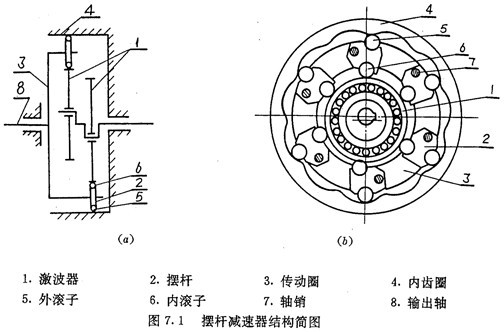 圖7.1所示為擺桿減速器的結(jié)構(gòu)簡圖。擺桿減速器也由四大部分組成:激波器1;擺動機(jī)構(gòu)(包括擺桿2,內(nèi)滾子6, 外滾子5和軸銷7);傳動圈3 以及與其固聯(lián)的輸出軸8;內(nèi)齒圈4?梢钥闯,除了擺動機(jī)構(gòu)外,其它構(gòu)成與推桿減速器類似。也采用了兩套完全相同且互成180°的激波器及內(nèi)齒圈以實現(xiàn)輸出的靜平衡和提高嚙合效率。