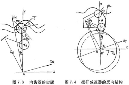 和推桿減速器一樣,當(dāng)理論擺動機(jī)構(gòu)數(shù)目比內(nèi)齒圈齒數(shù)少,即ZC=ZN-1時,機(jī)構(gòu)成為圖7.4所示的反向結(jié)構(gòu),在此結(jié)構(gòu)中,擺桿外滾子中心在與內(nèi)齒圈固聯(lián)的