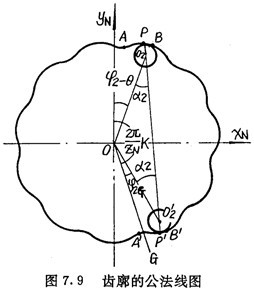 如圖7.9所示,AB是其中一個齒槽的一側(cè)齒廓,A′B′是跨教為K(圖中K=5)的一個齒槽的另一側(cè)齒廓。設(shè)內(nèi)齒圈的齒廓曲線在圖示坐標(biāo)系下可用方程式(7.9)來表示,現(xiàn)在來求齒廓AB及齒廓A′B′上具有的公法線。