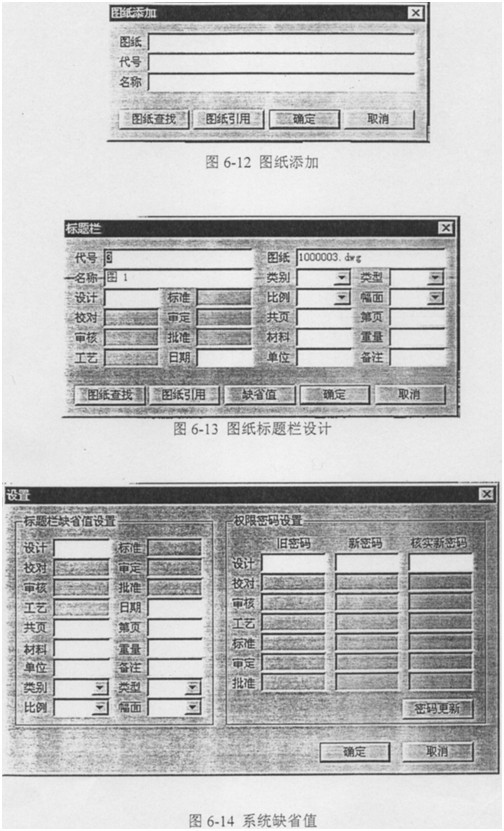 根據(jù)相應項的密碼輸入,再選擇/添加/刪除產(chǎn)品,見圖6-10,進行圖紙管理系統(tǒng)的主畫面(見圖6-11),進而對產(chǎn)品選擇、圖紙進行添加、刪除(圖6-12)及其編輯,明細表、標題欄的設計(圖6-13)以及一些系統(tǒng)缺省值(圖6-14)的固定等等;
