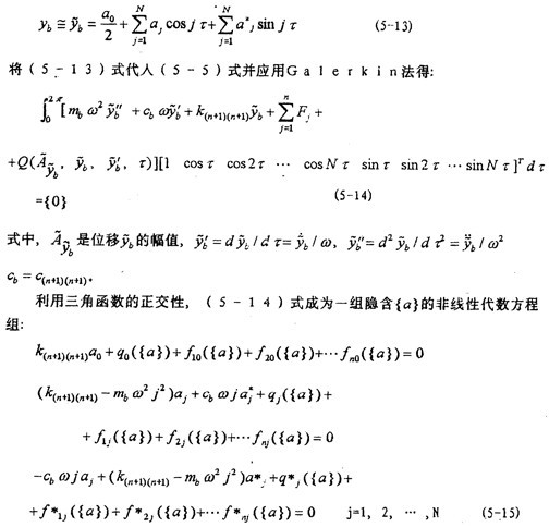 {fj({ a(k)})}是式(5-6)中恢復(fù)力Fj的傅立葉級(jí)數(shù)展開(kāi)式各諧波分量的系數(shù)向量。當(dāng)向量{ a(k)}給定時(shí),首先由5-2節(jié)中所述方法算得各個(gè) 和 (j=1,2,…,n),其次由(5-6)式中恢復(fù)力Fj的各諧波分量的系數(shù)向量{fj({ a(k)})}。