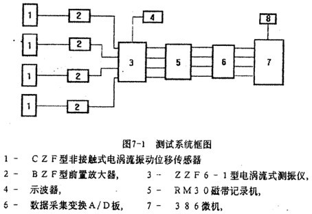 如圖6-l所示,實(shí)驗(yàn)臺(tái)安裝在一個(gè)4噸重的鋼質(zhì)平臺(tái)上,兩個(gè)球面球軸承支座1支承一根直徑為30毫米,長(zhǎng)度為1500毫米的等直徑軸3,兩軸承座中間的袖上裝有一個(gè)直徑為300毫米,厚度為50毫米的圓盤2,軸的外伸端與調(diào)速電動(dòng)機(jī)5之間有鋼絲繩聯(lián)軸器4相聯(lián)。在圓盤外緣以及在聯(lián)抽器從動(dòng)端(內(nèi)套)與袖外伸端聯(lián)結(jié)處的水平和垂直方向各安裝一個(gè)非接觸式電渦流振動(dòng)位移傳感器6。測(cè)試系統(tǒng)框圖如圖7-1所示。