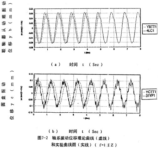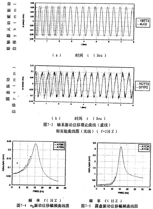 測(cè)量數(shù)據(jù)進(jìn)行分析處理后,結(jié)果如圖7-2~圖7-5所示。圖7-2(a)~(b)和圖7-3(a)~(b)分別給出調(diào)速頻率為1。2赫茲時(shí)圓盤和聯(lián)軸器從動(dòng)端y方向的振動(dòng)位移時(shí)域曲線,圖7-4、圖7-5分別給出聯(lián)軸器從動(dòng)端、圓盤y方向的振動(dòng)位移的理論和實(shí)驗(yàn)幅頻曲線圖(實(shí)線為理論曲線,圓點(diǎn)線為實(shí)驗(yàn)曲線),總的來(lái)看,理論與實(shí)驗(yàn)結(jié)果較好地重合。然而,在某些頻率點(diǎn)處,振運(yùn)位移幅值的理論計(jì)算與實(shí)驗(yàn)結(jié)果相差值,雖然絕對(duì)值差異并不大,但從相對(duì)值來(lái)講,差異較大,這是由于軸系還受到諸多因素,如軸承認(rèn)、軸承、電動(dòng)機(jī)等振動(dòng)的相互影響;當(dāng)然,測(cè)試儀器,數(shù)據(jù)處理都有可能產(chǎn)生誤差。由圖7-2、7-3還可以看到,理論計(jì)算與實(shí)驗(yàn)所得的振動(dòng)位移時(shí)域曲線之間存在著相位差,這是因?yàn)椴杉瘮?shù)據(jù)時(shí),時(shí)域曲線的相位不能保證與理論計(jì)算相位一致造成的,但這不影響兩者的本質(zhì)特性。