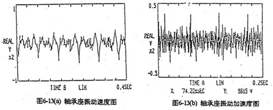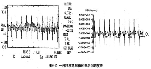 由于每片齒板都存在同樣的周期性激勵(lì)沖擊函數(shù),相位差120°,迭加后的總效果仍然是轉(zhuǎn)頻周期函數(shù)。因此對(duì)箱體軸承座的沖擊也呈周期性。圖6-13是支承軸箱體軸承座的振動(dòng)速度及加速度的實(shí)測(cè)時(shí)域曲線(xiàn)圖。其曲線(xiàn)圖的變化規(guī)律及幅值與圖6-4完全接近。速度及速度沖擊值為