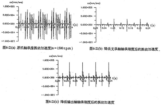 降低箱體軸承剛度是為了吸收內(nèi)部機(jī)構(gòu)對(duì)箱體的沖擊振動(dòng),減小沖擊幅值。圖6-21是轉(zhuǎn)速為1500(rpm)即時(shí)分別將支承軸及輸出軸的箱體軸承與軸之間加一3mm的彈性墊圈時(shí),計(jì)算出的箱體振動(dòng)加速度曲線(xiàn)。從圖中看出,減小支承軸箱體軸承剛度比減小輸出軸箱體軸承的效果更明顯。