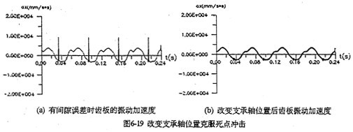 采用雙軸輸人的齒板及箱體軸承座振動(dòng)速度、加速度如圖6-17所示。從圖看出齒板速度及加速度值明顯變。閱屋S輸人時(shí)的0.3倍),而且無(wú)沖擊,完全屬于穩(wěn)太振動(dòng)。箱體的振動(dòng)速度及加速度幅值只是單軸輸人時(shí)的0.2倍。圖6-18a是一軸的偏心套存在0.05度的分度誤差時(shí)齒板的加速度曲線(xiàn)圖,圖中明顯出現(xiàn)加速度沖擊棒線(xiàn)。采用雙軸輸入后,死點(diǎn)沖擊被徹底(見(jiàn)圖6-18b) , 變成穩(wěn)態(tài)振動(dòng)曲線(xiàn)了。因此,為了減小三環(huán)減速器的振動(dòng),有必要加大三環(huán)減速器的橫向尺寸,在箱體內(nèi)增加一套雙軸輸入的齒輪功率分流機(jī)構(gòu),或者在箱體外另設(shè)計(jì)一套功率分流機(jī)構(gòu),以解決機(jī)構(gòu)過(guò)死點(diǎn)的振動(dòng)問(wèn)題。
