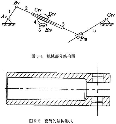 首先將原來的原理圖轉(zhuǎn)換成以下的機構結構圖(僅部分轉(zhuǎn)換),如圖5-4,即原來2、3構件之間是滑塊和連桿連接,現(xiàn)改為連桿、套筒改為加一個擺動軸結構,原來滑塊3和地面連接,容易形成過約束,改為加一個擺動軸承4來和地面、套筒來連接。擺動軸承內(nèi)芯相當于一個球副,其轉(zhuǎn)動中心必為內(nèi)芯的球心,當然也是整個擺動軸承的中心。這樣便于加工查和實驗實施,而且更重要的是可防止原來原理圖中桿件連接出形成過約束。
