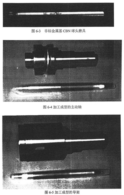 為保證空間正弦滾道的加工精度,工件經(jīng)過車削、銑削及高頻淬火等工藝流程后,必須對空間正弦滾道進(jìn)行精磨。對內(nèi)空間正弦滾道的磨削是比較困難的工藝流程,本文根據(jù)滾道及殼體內(nèi)圓柱面的形狀尺寸,進(jìn)行了非標(biāo)球頭磨具的設(shè)計。該非標(biāo)球頭磨具的材質(zhì)選用金屬基立方氮化硼(CBN),CBN濃度為100%,粒度為80目。其制造的工藝流程為:將立方氮化硼顆粒溶入液化的金屬基(銅)中,澆注在特定的模具中,冷卻凝固后,將金屬基CBN球頭與鋼質(zhì)刀柄用銀焊接在一起,最后采用電火花工藝將球頭按一定精度加工成型,由此更好的保證了球頭磨具的型位公差。為防止磨削時產(chǎn)生的積屑降低磨具的磨削硬度及精度,在磨具的球頭部位還設(shè)計有排屑槽。加工成型后的金屬基CBN球頭磨具見圖6-3。最終加工成型的主動軸、導(dǎo)架、殼體、其它關(guān)鍵件及裝配后的減速器樣機(jī)見圖6-4~圖6-8。