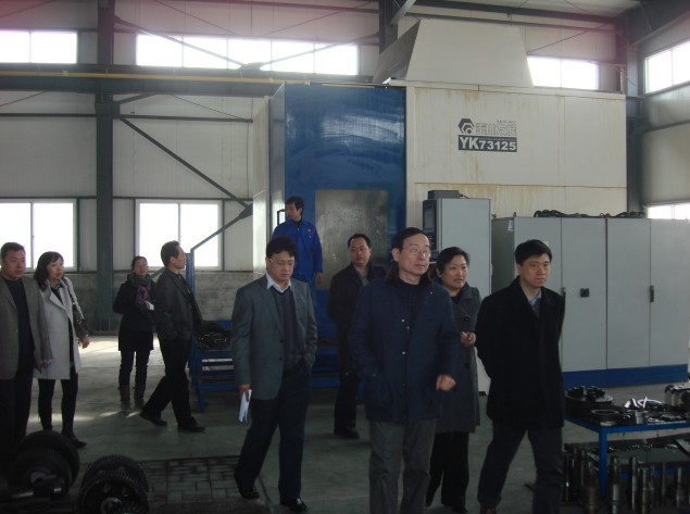 韓祝強縣長、張軍會長、劉占坤總經理在大型數控磨齒機旁