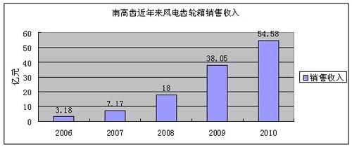2010年南高齒實(shí)現(xiàn)銷售收入73.93億元,較2009年56.47億元增長30.9%。其中風(fēng)電齒輪箱繼續(xù)保持高速增長態(tài)勢,全年實(shí)現(xiàn)銷售 收入54.58億元,較2009年大幅增長43.4%,2009年風(fēng)電齒輪箱銷售收入為38.05億元。