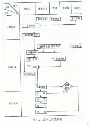 第四步競購。由進(jìn)入競購范圍的供應(yīng)單位或個人向供應(yīng)科提交申報單,載明:所競購物資名稱、產(chǎn)地、規(guī)格、數(shù)量、質(zhì)量、價格、交貨期、供應(yīng)渠道、售后服務(wù)等,一式兩份呈報物管辦和供應(yīng)科公開進(jìn)行競購。供應(yīng)科根據(jù)生產(chǎn)供應(yīng)計劃和所掌握的最低競價,選定2~3家為供貨單位,報物管辦備查。最后由供應(yīng)科與供貨單位簽訂合同,具體實(shí)施物資采購進(jìn)廠。 競購成功并簽訂合同的供貨單位須按合同要求,及時、保質(zhì)保量地供貨。若中途違約或物資使用過程中發(fā)現(xiàn)內(nèi)在質(zhì)量問題而造成損失、影響生產(chǎn),則按規(guī)定承擔(dān)違約責(zé)任。凡違約或質(zhì)量問題影響生產(chǎn)兩次以上者,一律取消其競購資格。 全程監(jiān)控 為明確各方面責(zé)任,公司從提出用料申請、編制物資采購計劃開始,到驗(yàn)收入庫、生產(chǎn)使用為止,制定了詳細(xì)的業(yè)務(wù)流程,所有環(huán)節(jié)一律按工作程序進(jìn)行全程管理。詳見圖4—2采購工作流程圖。 成本管理科將上述流程活動中所涉及的各類信息資料如原輔材料的價格、質(zhì)量、數(shù)量、供貨單位及聯(lián)系人、責(zé)任人等輸入微機(jī),隨時進(jìn)行查詢、分析、全程追蹤監(jiān)控。