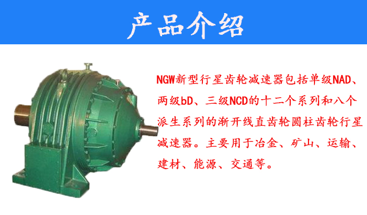 NGW新型行星齒輪減速器包括單級NAD、兩級NBD、三級NCD的十二個系列和八個派生系列的漸開線直齒輪圓柱齒輪行星減速器。主要用于冶金、礦山、運輸、建材、能源、交通等。