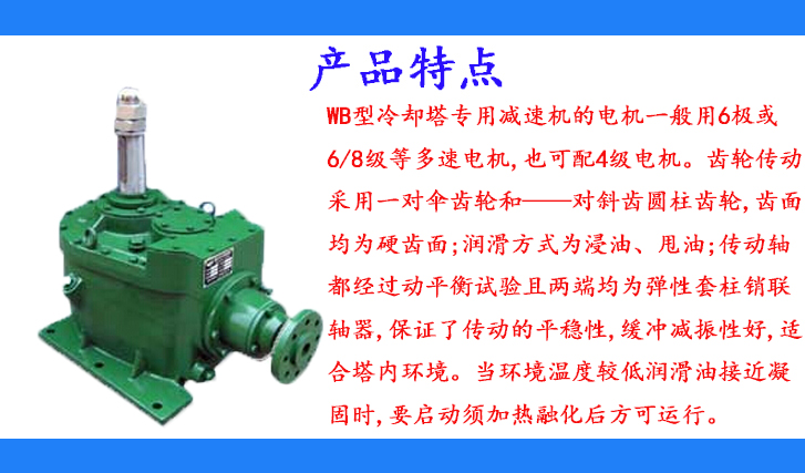 ■產(chǎn)品特點WB型冷卻塔專用減速機的電機一般用6極或/8級等多速電機,也可配4極電機。齒輪傳動采用一對傘齒輪和--對斜齒圓柱齒輪,齒面均為硬齒面;潤滑方式為浸油、甩油;傳動軸都經(jīng)過動平衡試驗且兩端均為彈性套柱銷聯(lián)軸器,保證了傳動的平穩(wěn)性,緩沖減振性好,適合塔內(nèi)環(huán)境。當環(huán)境溫度較低潤滑油接近凝固時,要啟動須加熱融化后方可運行。