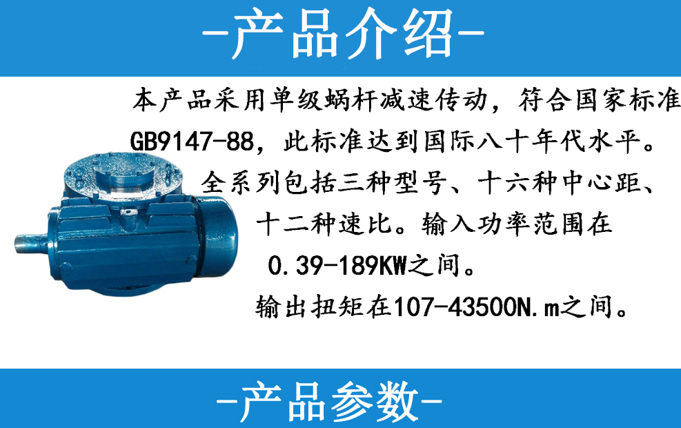 本產品采用單級蝸桿減速傳動,符合國家標準GB9147-88,此標準達到國際八十年代水平。全系列包括三種型號十六種中心距、十二種速比。輸入功率范圍在039-18K之間,輸出扭矩在107-43500Nm之間。