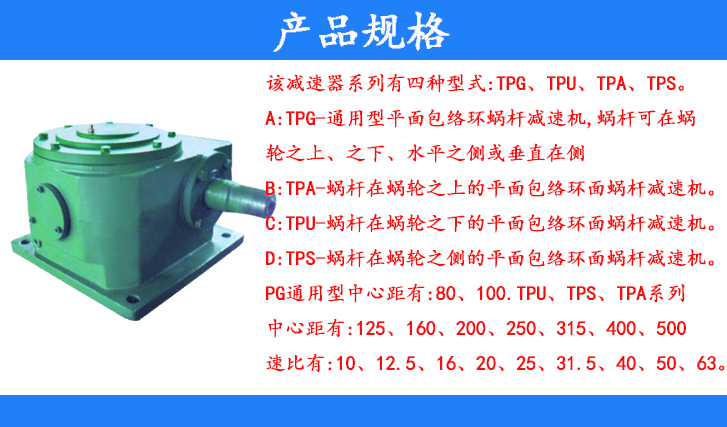 TP系列平面包絡(luò)環(huán)面蝸桿減速器(JBT9051-1999)為平面一次包絡(luò)蝸桿傳動,包括tpU、TPS、TPA三種形式,適用于冶金、礦山、起重、運輸、建筑、石油、化工、航天、航海設(shè)備或精密傳動的減速傳動。
