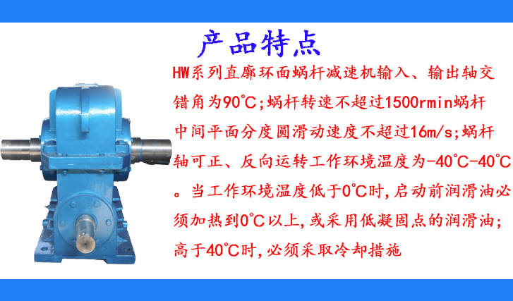 HW系列直廓環(huán)面蝸桿減速機(jī)輸入、輸出軸交錯(cuò)角為90℃;蝸桿轉(zhuǎn)速不超過(guò)1500rmin蝸桿中間平面分度圓滑動(dòng)速度不超過(guò)16m/s;蝸桿軸可正、反向運(yùn)轉(zhuǎn)工作環(huán)境溫度為-40℃-40℃。當(dāng)工作環(huán)境溫度低于0℃時(shí),啟動(dòng)前潤(rùn)滑油必須加熱到0℃以上,或采用低凝固點(diǎn)的潤(rùn)滑油;高于40℃時(shí),必須采取冷卻措施