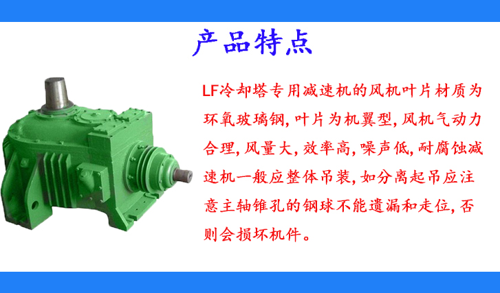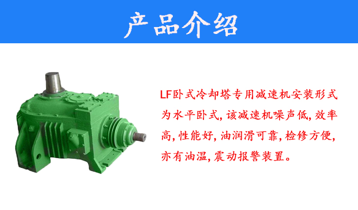 LF臥式冷卻塔專用減速機(jī)安裝形式為水平臥式,該減速機(jī)噪聲低,效率高,性能好,油潤滑可靠,檢修方便,亦有油溫,震動報警裝置。