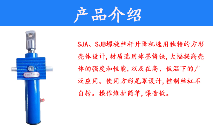 SJA、SJB螺旋絲桿升降機(jī)選用獨(dú)特的方形殼體設(shè)計(jì),材質(zhì)選用球墨鑄鐵,大幅提高殼體的強(qiáng)度和性能,以及在高、低溫下的廣泛應(yīng)用。使用方形尾罩設(shè)計(jì),控制絲杠不自轉(zhuǎn)。操作維護(hù)簡(jiǎn)單,噪音低。