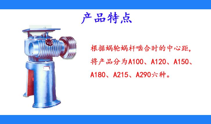 根據(jù)蝸輪蝸桿嚙合時(shí)的中心距,將產(chǎn)品分為A100、A120、A150、A180、A215、A290六種。