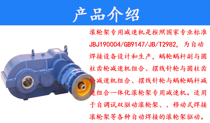 滾輪架專用減速機是按照國家專業(yè)標準JB19004/GB9147/JB/T2982,為自動焊接設備設計和生產的,蝸輪蝸桿副與圓柱齒輪減速機組合、擺線針輪與圓柱齒輪減速機組合,擺線針輪與蝸輪蝸桿減速組合一體化滾輪架專用減速機。適用于自調式雙驅動滾輪架、移動式焊接滾輪架等各種自動焊接的滾輪架驅動。