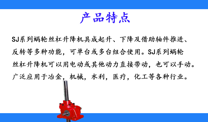 SJ系列蝸輪絲杠升降機具成起升、下降及借助軸件推進(jìn)、反轉(zhuǎn)等多種功能,可單臺或多臺組合使用。