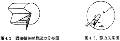 ρ與該點到原新的距離ρ成正比。因為Yρ發(fā)生于垂直于半徑的平面內(nèi),所以Yρ也與半徑垂直。如果注意到剪應(yīng)力互等定理,則在縱向截面和橫截面上,沿半徑剪應(yīng)力的分布如圖4.2所示
