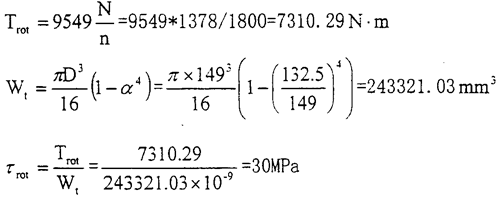 根據(jù)實際情況計算出工作時的剪應(yīng)力:GK2型內(nèi)燃機(jī)車啟動發(fā)電機(jī)ZQF-38TH,115V,38KW,1170~358Or/min;GK2型內(nèi)燃機(jī)機(jī)用柴油機(jī)型號為MTU16V396TC14,持續(xù)功率為1378KW,旋轉(zhuǎn)角速度為18O0rad/min。柴油機(jī)冷區(qū)液溫度為40℃時最小啟動轉(zhuǎn)矩包括加速余量約8OON.m,曲軸扭矩約75ON.m