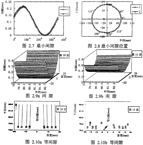 不失一般性設(shè)內(nèi)齒輪為主動(dòng)輪外齒輪相對內(nèi)齒輪徑向位移Δx=-0.2mm,Δy=0.無載荷的情況下計(jì)算結(jié)果:圖2.7是內(nèi)齒旋轉(zhuǎn)一周時(shí)任意一對齒的最小間隙的變化或在任意的轉(zhuǎn)角0下各齒對的最小間隙。2.8 圖是半徑方向最小間隙所在的位置,由于外齒是鼓形齒且沒有偏角,在無載荷的情況下只在齒輪的中央齒廓處嚙合所以僅畫出半徑方向最小間隙位置。圖2.7 曲線1 是用本章方法計(jì)算的結(jié)果,曲線2 是用Heinz 幾何方法計(jì)算的結(jié)果,我們可以看出用兩種方法計(jì)算最小間隙的大小非常一致,但位置不同圖2.8 ,因?yàn)镠einz 方法僅規(guī)定內(nèi)外齒在分度圓上嚙合,本文是從全齒高嚙合狀態(tài)來考慮最小間隙及其位置的。圖2.7中250° 近間隙為零,即在無載荷或輕載荷時(shí)內(nèi)外齒輪在此處附近的對齒嚙合,相應(yīng)圖2.8 在250°嚙合處的縱坐標(biāo)大致為基圓的半徑,即嚙合線與基圓相切并與△x 位移線平行,這與前面所說與零齒差齒輪嚙合相似;圖2.9, 2.10 是在θ=0時(shí)第39 齒(圖a)和第13齒(圖b)的齒面間隙和等間隙曲線,從圖中可以看出最小間隙在齒寬的中央,這是因內(nèi)外齒沒有發(fā)生相對轉(zhuǎn)角位移,而且間隙沿齒高方向間隙變化的梯度小,即分度圓上的間隙與齒高方向的間隙相關(guān)很小,而沿著齒輪軸向的間隙變化的梯度較大,等間隙曲線沿軸向分布呈帶狀,這也是Heinz和本文計(jì)算最小間隙大小相近的原因。
