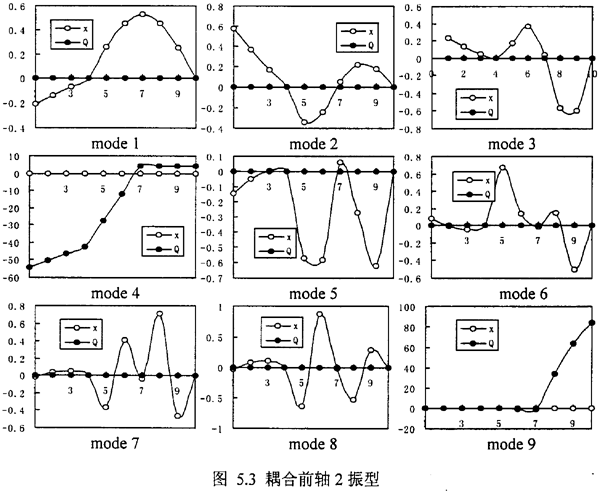 但是,另外我們可以發(fā)現(xiàn),在表5.3中出現(xiàn)了許多表5.1和表5.2中所沒有的新的固有頻率如λ4co,λ7co,λ8co,λ11co,λ12co,λ13co,觀察這些因有頻率所對應(yīng)的振型,可以發(fā)現(xiàn),它們對應(yīng)又可分為三種,1.純的彎曲耦合振型λ7co,λ8co對應(yīng)振型圖5.4中mode7、8;2.純的扭轉(zhuǎn)耦合振型λ4co,λ13co對應(yīng)振型圖5.4中mode4、13;3.彎扭振型相迭加的復(fù)振型——彎扭耦合振型λ11co,λ12co對應(yīng)振型圖5.4中mode11、12。這種彎耦合振型是由于齒輪聯(lián)軸器的耦合作用而新產(chǎn)生的,這是齒輪軸系統(tǒng)區(qū)別于一般單轉(zhuǎn)子系統(tǒng)的重要特征之一,由于彎扭耦合模態(tài)的產(chǎn)生,決定了軸系統(tǒng)的振動是彎扭耦合振動。