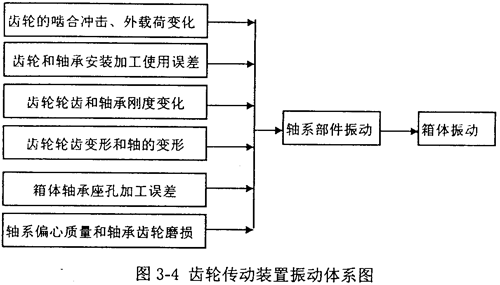 裝有齒輪、軸和軸承的軸系是齒輪傳動裝置的關鍵部件。在齒輪傳動裝置的工作過程中,箱體與其內部的軸系部件構成一個振動耦合體系,見圖3-4。軸系部件的振動通過軸承激發(fā)箱體振動,這樣在軸承外圈上安裝套圈并粘貼應變片,拾取套圈上的應變信號,也就是對齒輪傳動裝置箱體所受的動態(tài)激勵力信號進行測試和分析,就可對齒輪傳動裝置內的軸系部件進行故障診斷。這種振動測試故障診斷的方法優(yōu)點是能直接拾取齒輪傳動裝置內的軸系部件的振動故障信號,頻響范圍寬,費用低。缺點是需專門制做套圈。